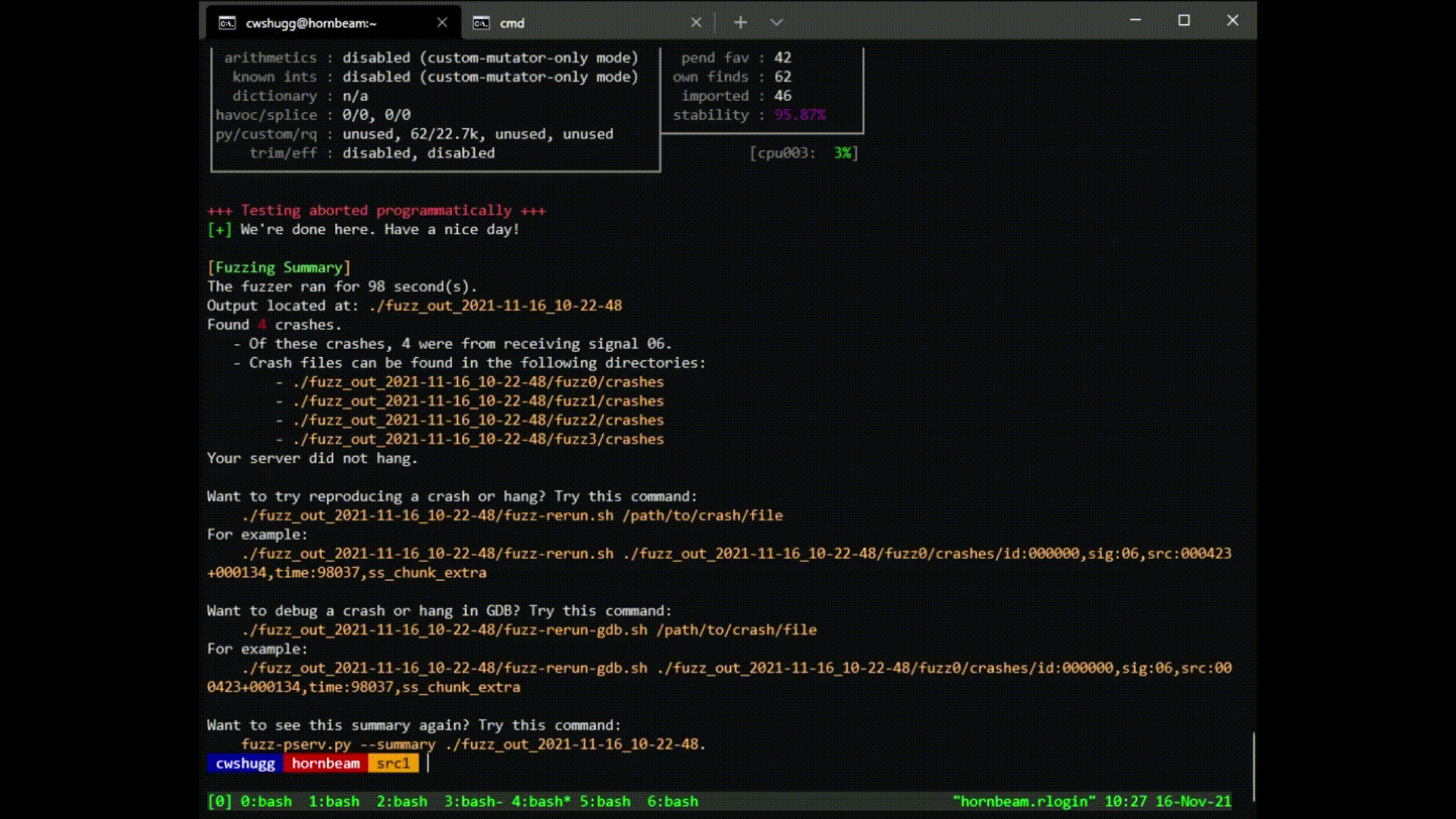 - Look at the summary: if any crashes or hangs are found, use these files to debug.