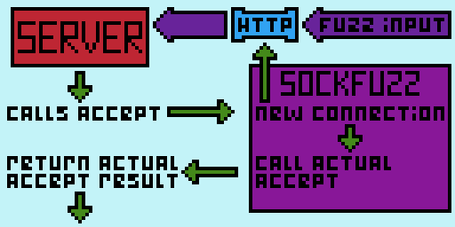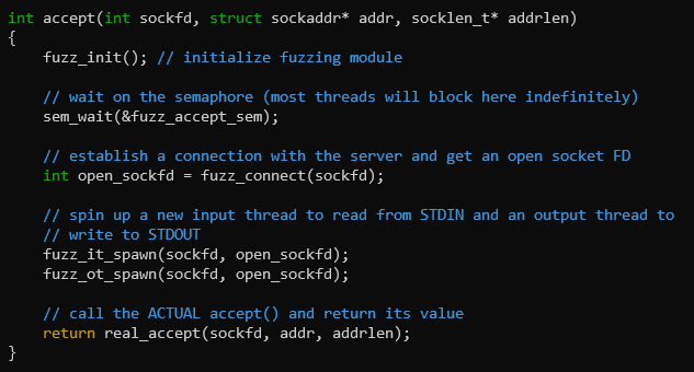 Once called, sockfuzz only allows one thread to finish the call to accept. The others are forced to block on a call to sem_wait. The one thread that is allowed through runs code that makes a connection to the server, spawns two threads, and calls the real accept system call, returning its value. From your point of view, your server behaves just about the same when preloaded with sockfuzz, apart from using only one its threads and setting up that internal connection.