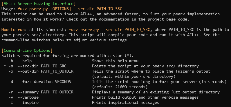 Once AFL++ has terminated, (either when finding a bug or after a set timeout) the script will print a summary of the crashes/hangs that were found. By default, the output directory will be placed in your pserv's src directory (specified by --src-dir). However, you can use the --out-dir switch to specify otherwise.